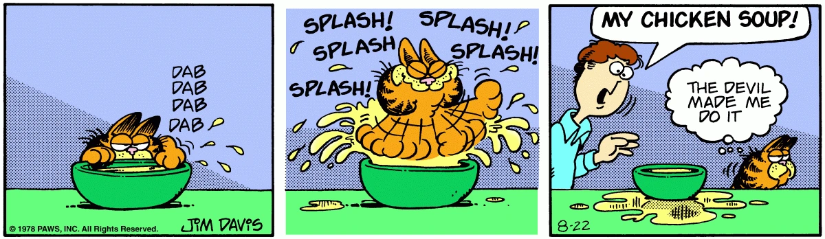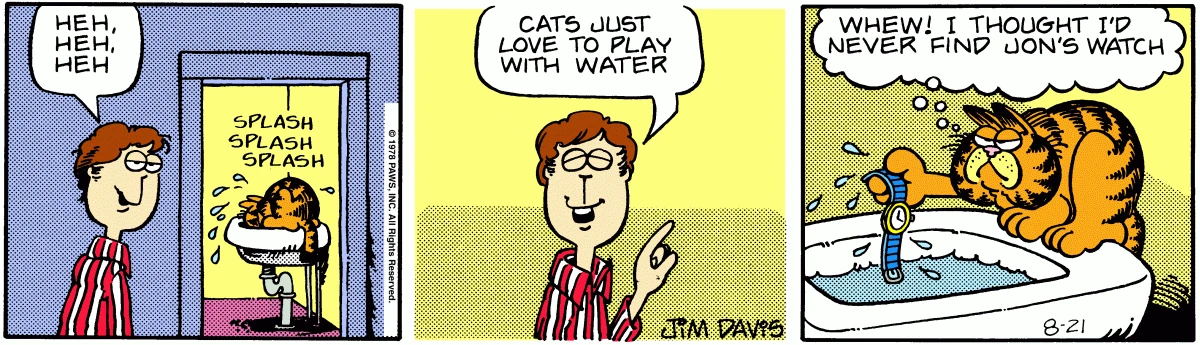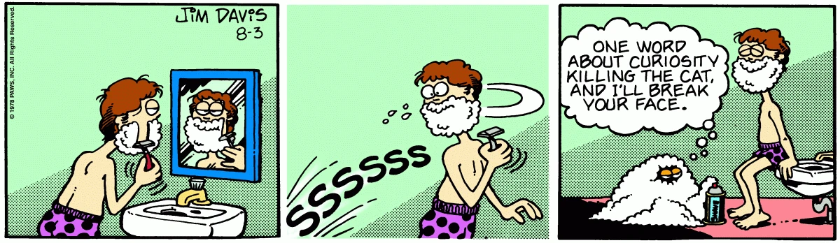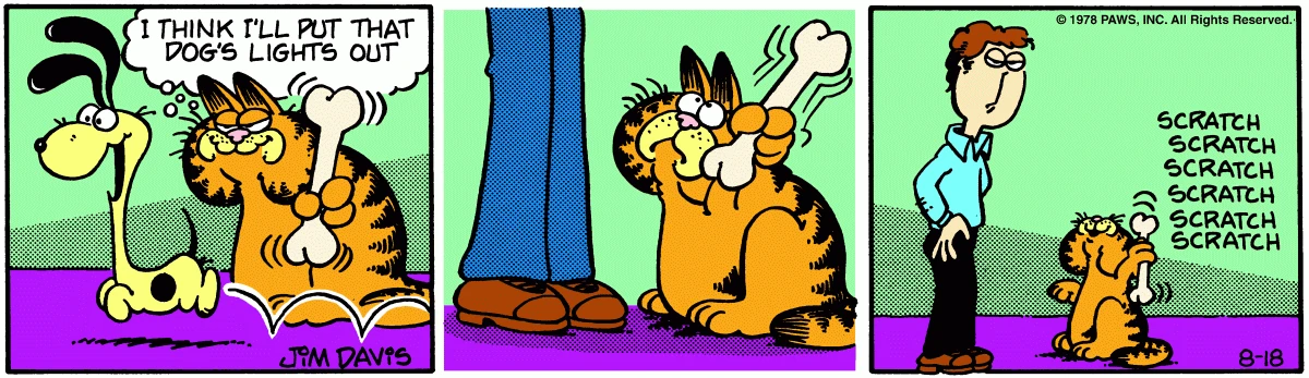 - August 11, 1978: (This strip's dialogue is adapted in Here Comes Garfield.)