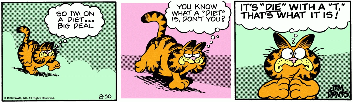 - August 27, 1978: (The start of a storyline about Garfield going on a diet.)