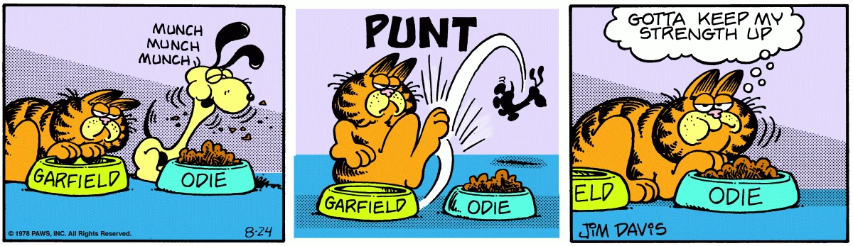 - August 31, 1978: (This is the first time Garfield punts Odie.)