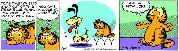 - August 7, 1978: (The first appearance of Lyman and the start of a storyline about Lyman and Odie taking residence in Jon's house. This and the next strip are adapted as a flashback in The Garfield Show episode "Long Lost Lyman Part 1".)