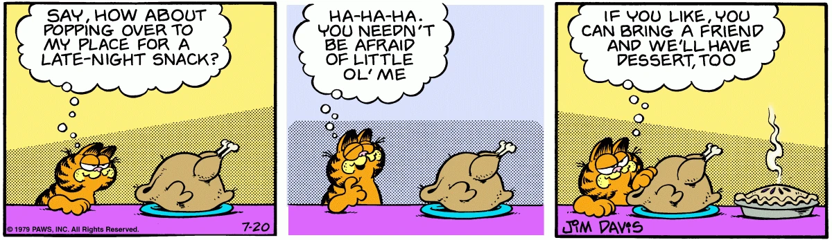 - July 24, 1979: (Most of the strip's dialogue was used in Garfield's Thanksgiving.)