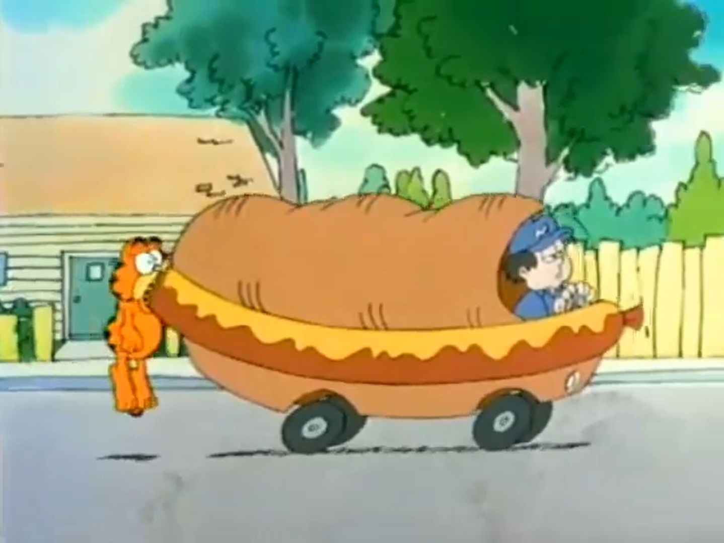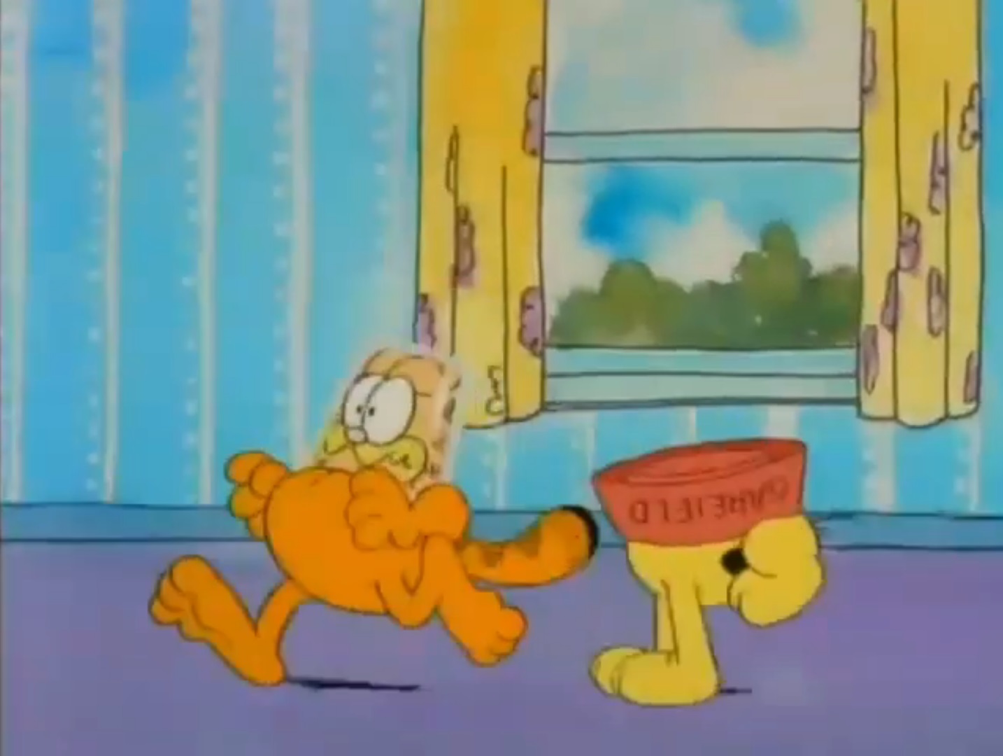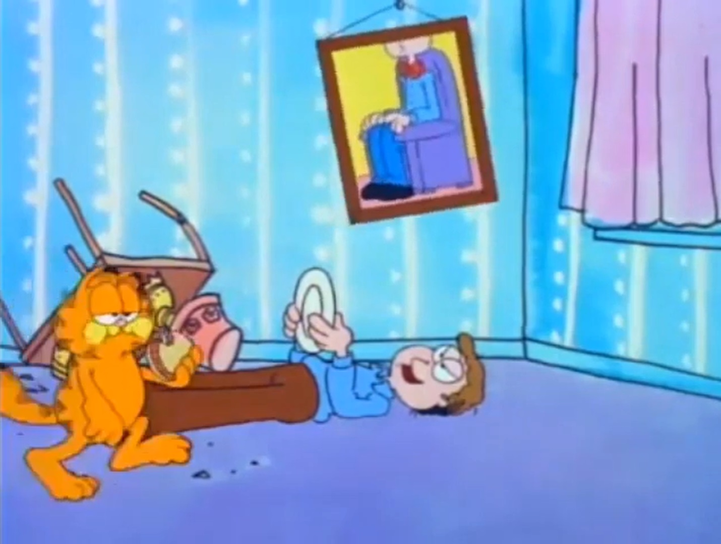 - Description: Jon calls Garfield for dinner, but Jon ran out of regular cat food and is instead feeding Garfield dry cat food. Garfield is disappointed, but hearing the line, "I'm sure you know what to do with it." gives the cat an idea. He dumps the food onto the floor toward Jon, who steps on it and slips, dropping his burger in the process. He lies on his back after crashing into a table, shattering a lamp in the process. Garfield walks by, eating the hamburger, and says that he should have the food more often. A picture then lands and breaks on Jon's head.