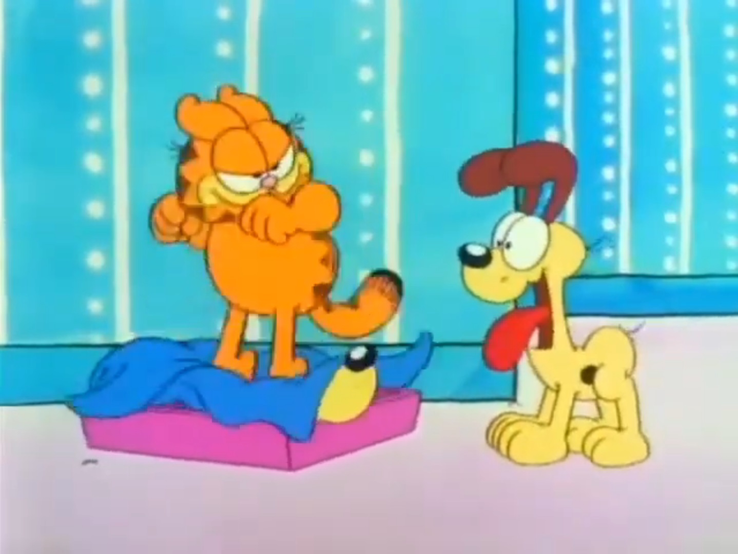 - Odie pauses for a moment to look at the audience and show his annoyance at Garfield's antics, and Garfield himself has a few extra one-liners.