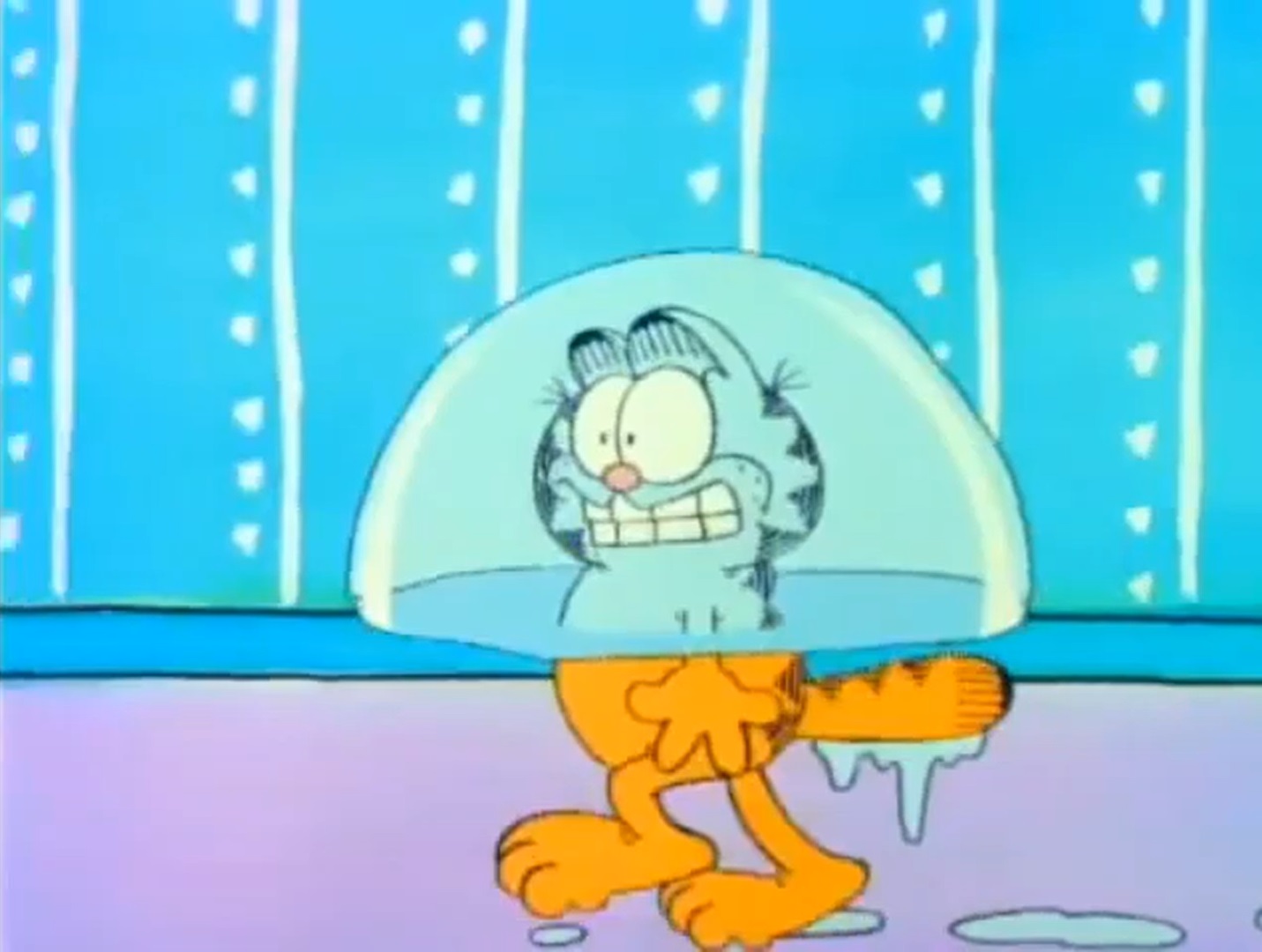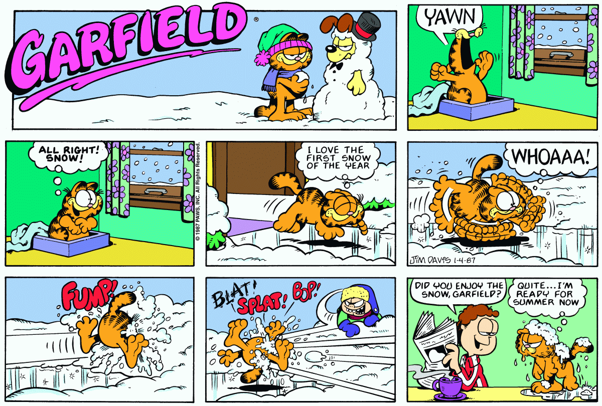 - Description: Garfield looks out the window and sees that it snowed the night before. He runs outside to play in it, but slips on the icy sidewalk and skids into a snowbank. He still loves snow, but is instantly pelted by snowballs by a couple of boys. He quickly dives on the other side of the bank, but lands in a birdbath and instantly freezes, save for his tail. He returns inside, his top half inside a hemisphere of frozen ice from the birdbath, ready for summer.