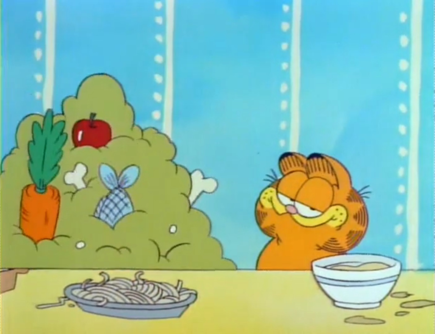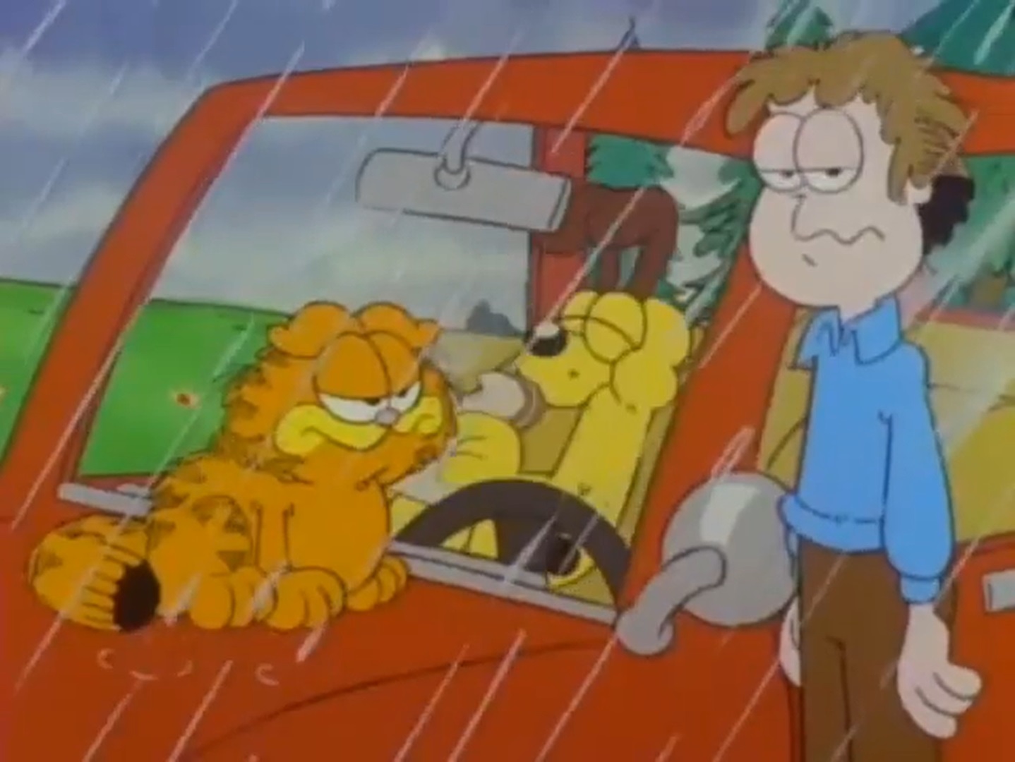 - Jon's first line is altered. Instead of saying "canned cat food", he calls it "[Garfield's] regular cat food".