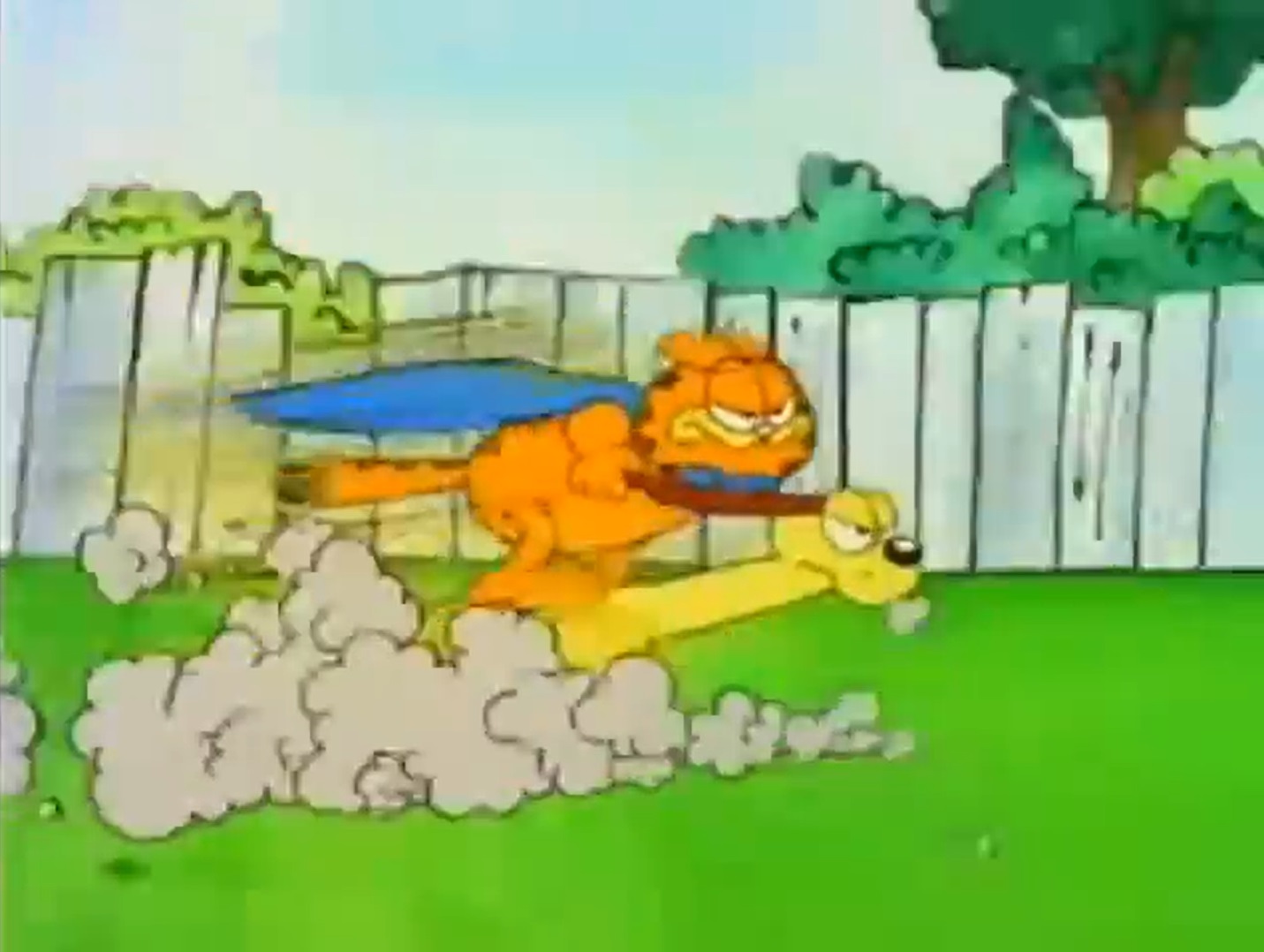 - Description: Garfield, as the Caped Avenger, leaps on Odie's back, wondering if the pup can be the his "high powered mode of transportation." Odie gives an "Ugh" look, but goes with it anyway. Garfield tells him to go faster, and faster, with Odie complying each time, and when Garfield tells him to stop, he stops so fast that the fat cat is flung off of him and into the ground, so fast that he created a dirt path in the yard. He realizes that he needs a seat belt.