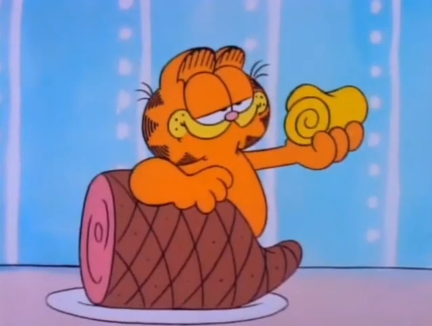 - Description: Garfield watches Odie run by him. Garfield looks on in disgust as Odie chases his tail through the living room, and then does the same thing next to Jon as the latter eats. The fat cat is appalled until Jon gives Odie a big slice of ham. Garfield looks at Odie trot by with the ham is his mouth, and despite ridiculing him for it, Garfield does the same thing that Odie was doing. "Hey, a ham's a ham." he explains and continues panting.