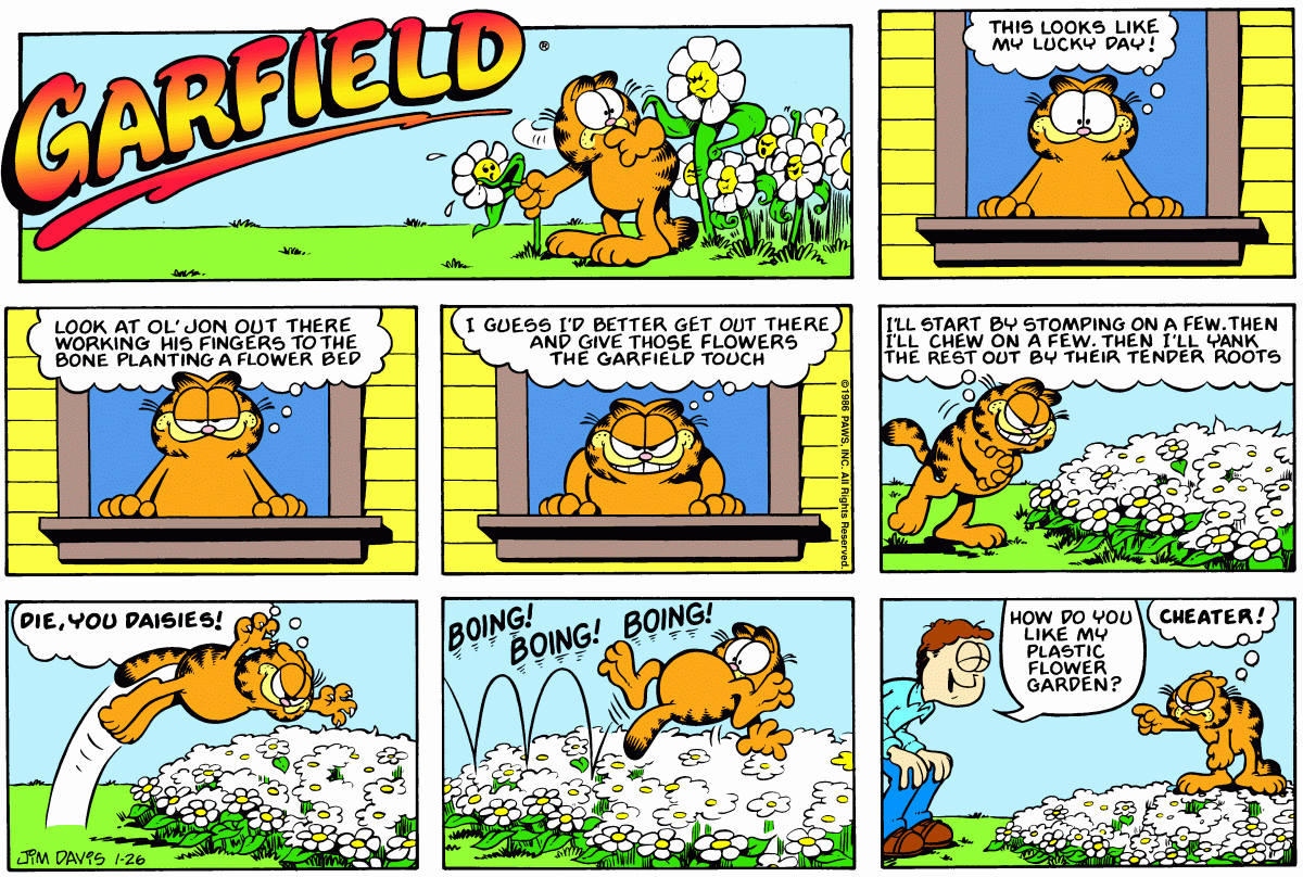 - Description: Jon plants some flowers in his flowerbed. Garfield watches from the window, and decides to give the bed "the Garfield touch". He leaps out of the window, walks up to the flowers, and leaps on them. However, he starts bouncing on them and eventually bounces into a wheelbarrow full of tools, dazing him. Jon walks up and tells Garfield that he planted plastic flowers. Garfield accuses him of cheating.