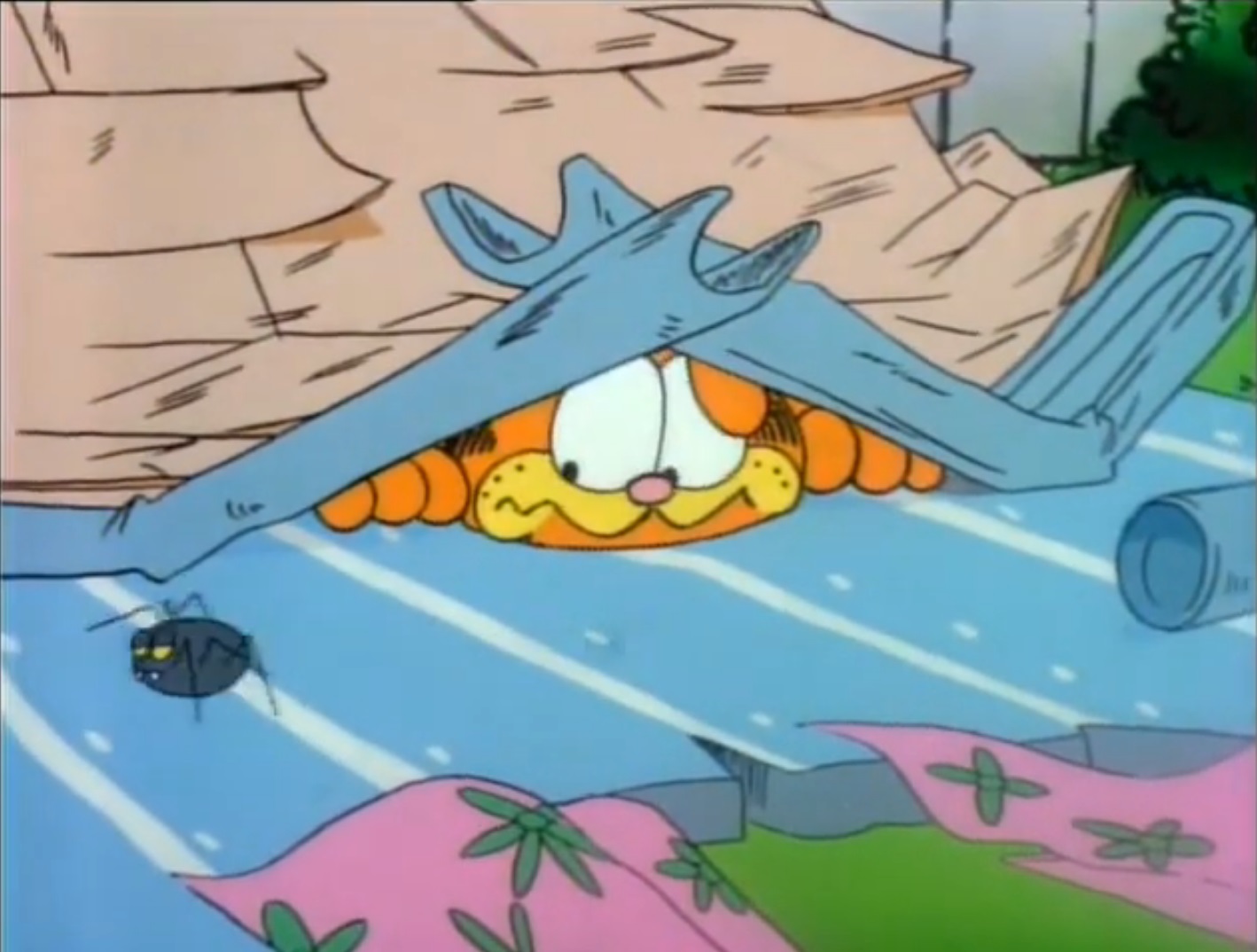 - Description: After spying on several birds in a birdbath, Garfield tiptoes over to them, trying to capture one. They all get scared and fly away, but the birdbath gives Garfield an idea. He removes the birdbath and stands with his mouth in a bowl shape. He fills up his mouth with hose water, and compliments himself for his genius. It quickly backfires when a bird as big as he is takes a bath in his mouth, and he starts regretting it.