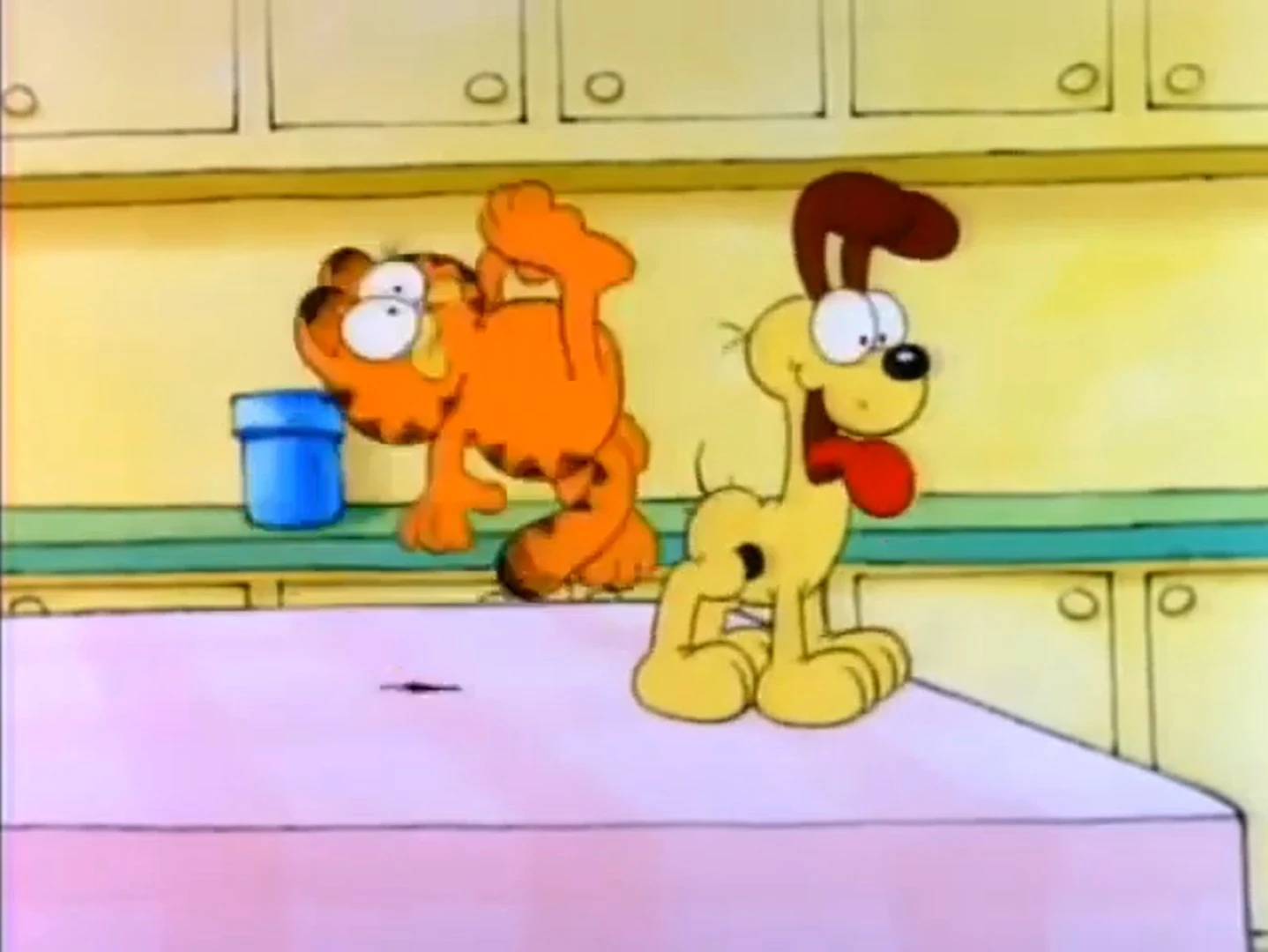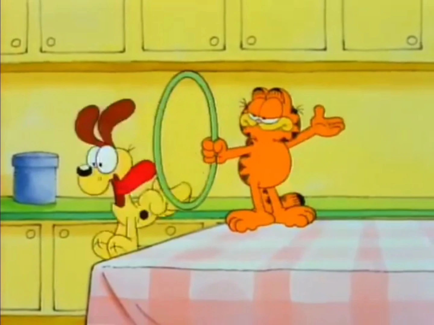 - Description: Garfield presents to the audience kicking Odie off the table. He steps up, but misses so hard he flips and lands on his face, causing him to see stars. Odie notices his friend behind him and feels sorry for him. He taps Garfield on the head, getting his attention, and voluntarily jumps off the table himself, landing with a thud. He gets back up, bruised from the fall, and he and Garfield shake paws. "Thanks, buddy." Garfield says.