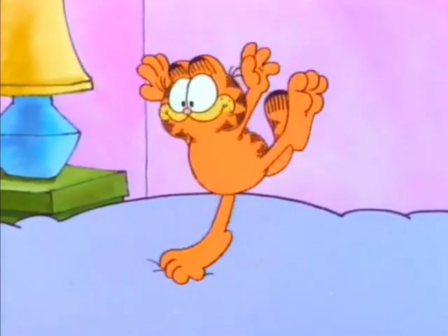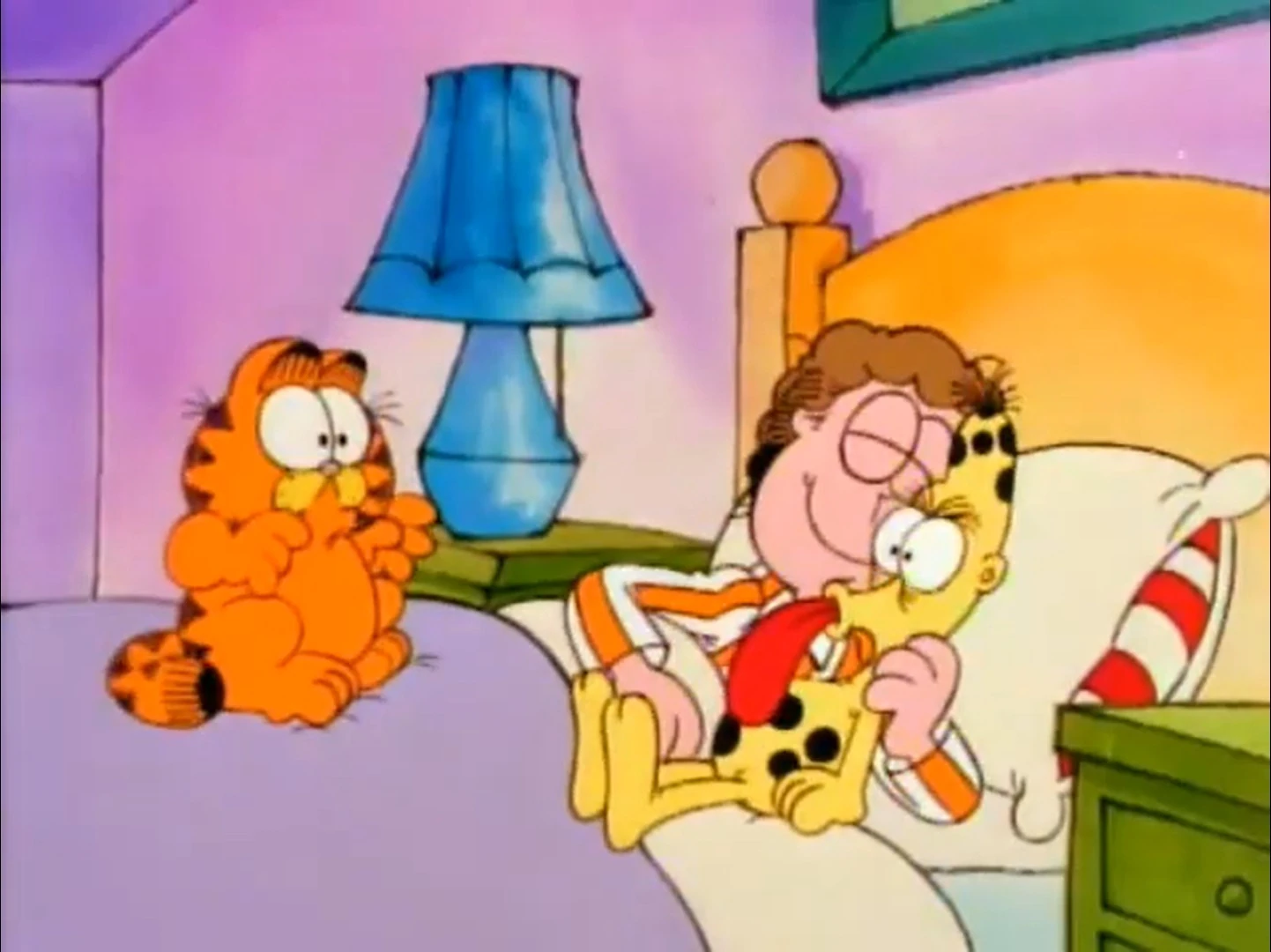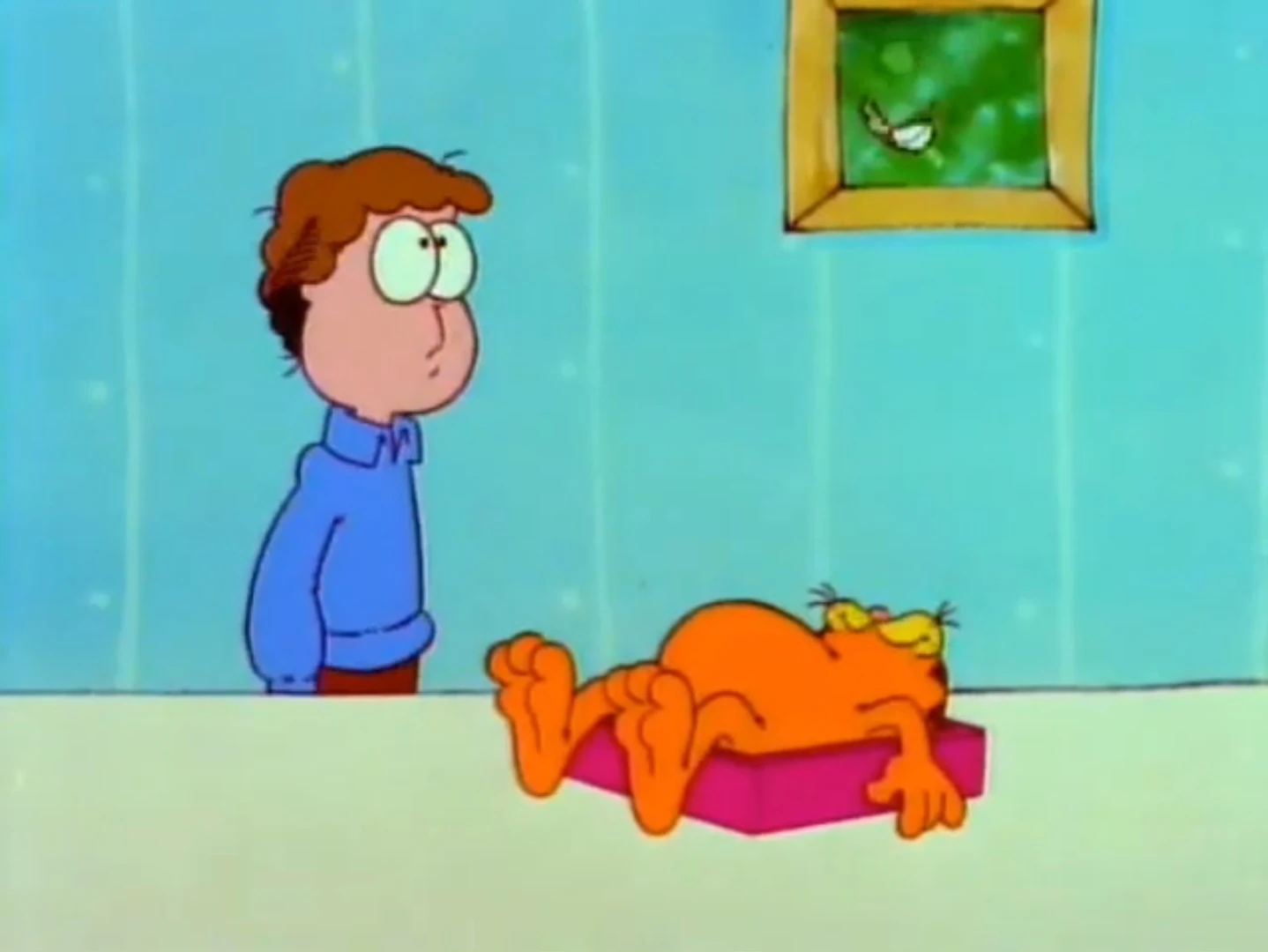 - He also says, "I wish you wouldn't do that." when Garfield sits on his bed.