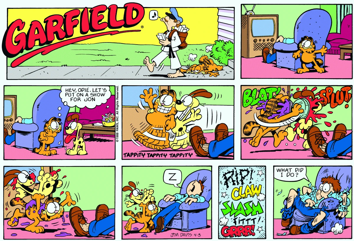 - Description: Garfield and Odie decide to put on a show for Jon while he sits in a chair. Together, they dance, throw pies in each other's faces, and Garfield holds Odie up on one paw. After they're done, they take a bow, only to realize that Jon was sleeping. Irritated, the pets climb up Jon's leg and beat him up, They leave satisfied, and Jon wonders what he did to deserve that.