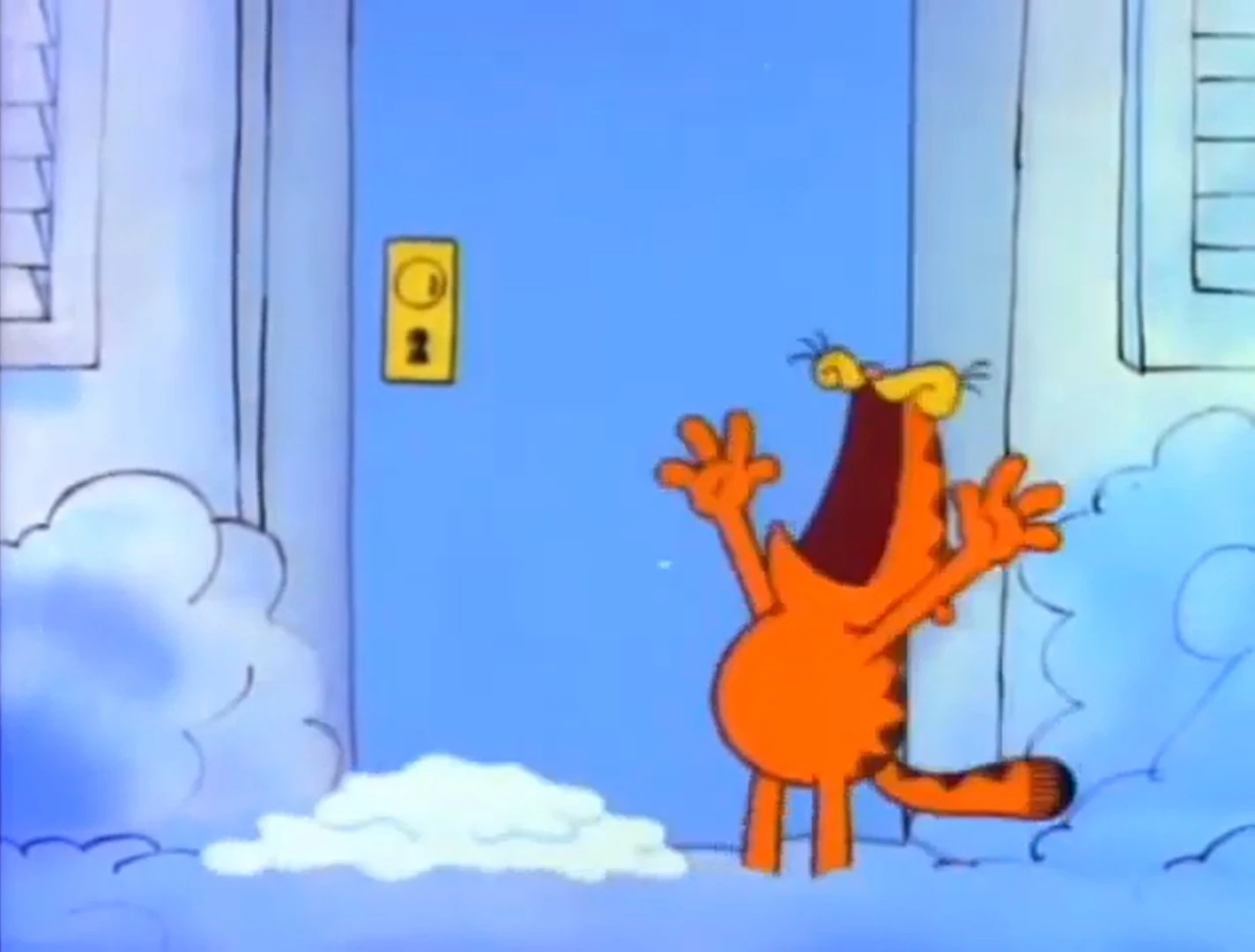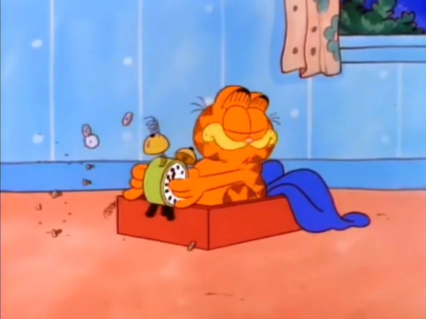 - Garfield also crouches down after closing the drapes, instead of standing and pointing.