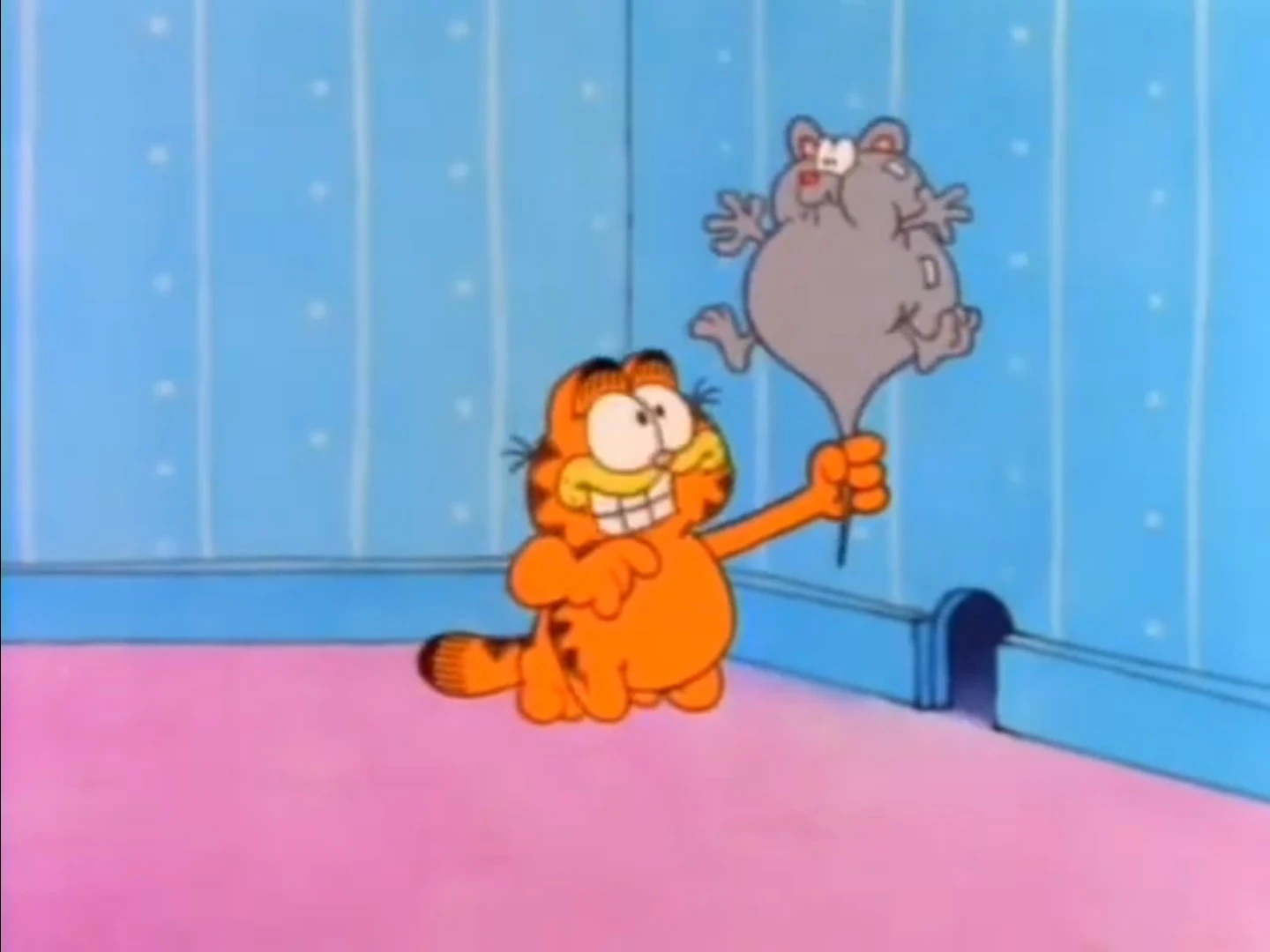- Description: Odie tiptoes to an unsuspecting Garfield and gives him a big lick. The cat is angered by this, which prompts Odie to run. Garfield pauses for a moment and then takes off after the pup. They run through the house until Odie skids to a stop in front of a wall with a mousehole. Garfield thinks he has him, but slams face first into the wall. He falls down and shakes his head, wondering where Odie went, and then peeks into the mousehole. When he does, Odie's tongue gives him another giant lick, much to his frustration.