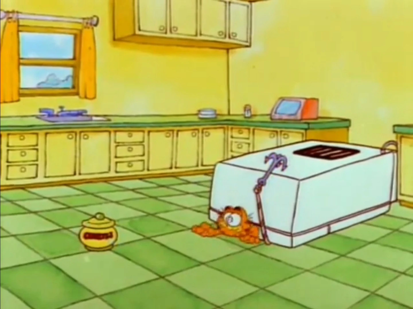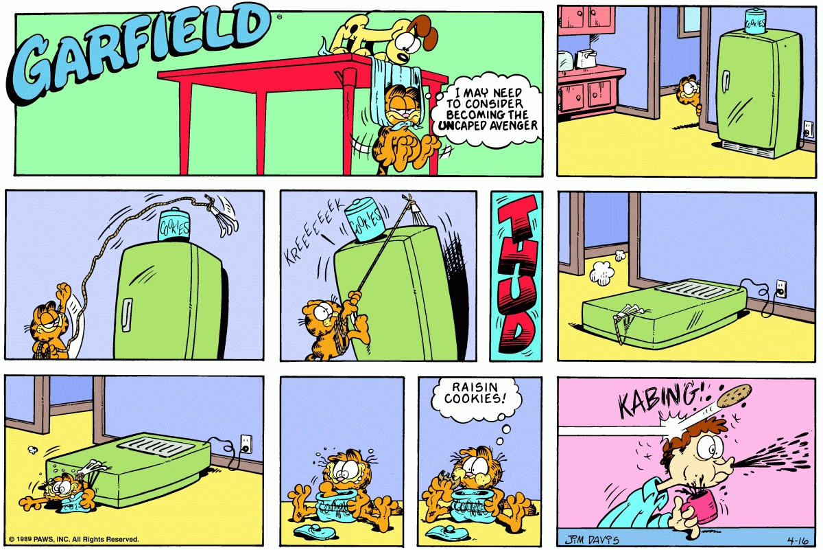 Raisin Cookies: Garfield crawls out from under the fridge after an attempt to get the cookie jar went haywire.