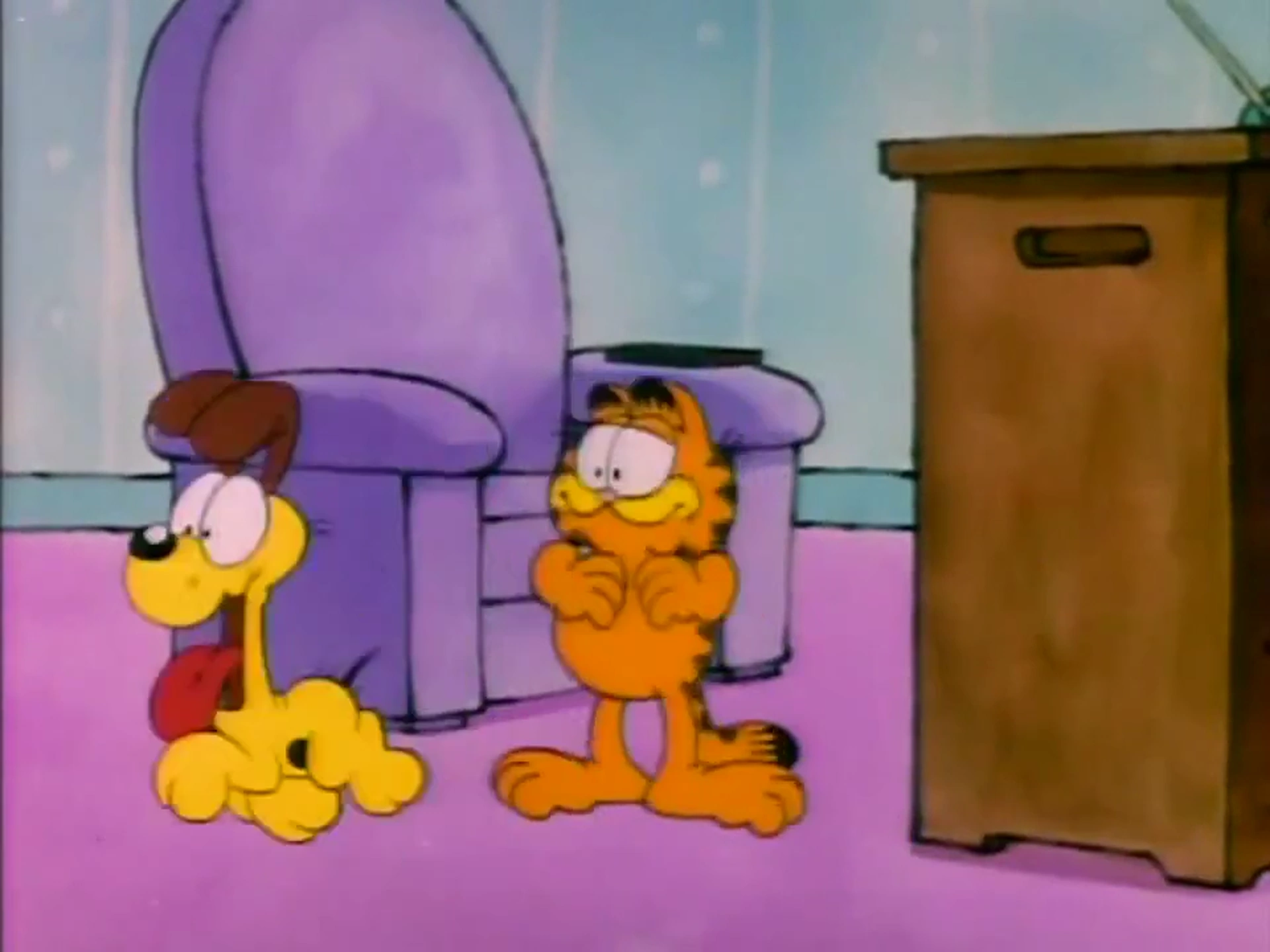 - When Odie passes by after Garfield has finished watching TV, the colors of Garfield's ears have been reversed.